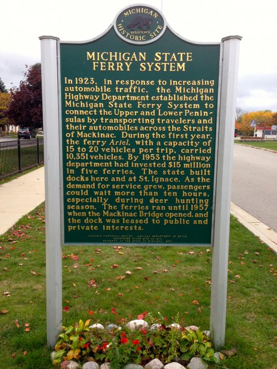 The Straits Harbor in Mackinaw City, MI, is on Lake Huron and was next to my hotel, just up the road from the town. According to this sign, this is the location of the original car ferries that ferried people and their cars between Mackinaw City in Michigan's Lower Peninsula and St. Ignace,in the Upper Peninsula. The car ferry service was operated by the state highway department and served as a water highway, one of the first of its kind.